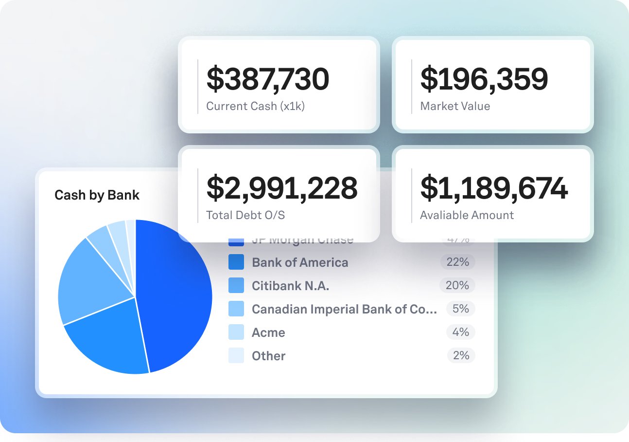 Cash reporting and positioning across banks and entities, with real-time visibility into liquidity.
