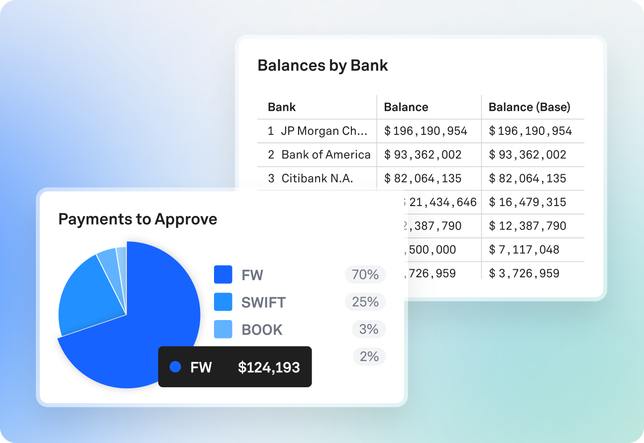 A complete treasury operating system built on the same powerful data foundation. Integrate and automate workflows across cash, banking, capital markets, payments, and accounting.