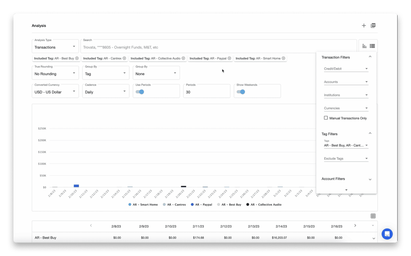 Cash inflows and outflows can be categorized into specific datasets, allowing your treasury team to efficiently search and filter transactions based on key vendors and institutions.