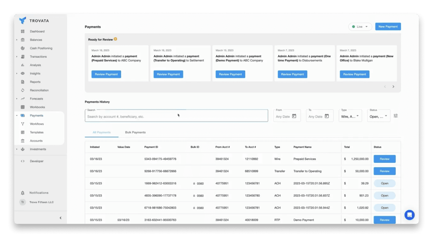 By integrating critical financial operations into one platform, Trovata empowers businesses to optimize their working capital and improve financial agility.