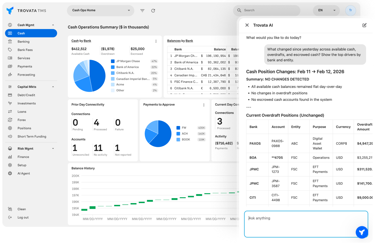 Embedded intelligence that explains what changed—and why—across cash, liquidity, and risk